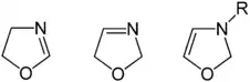 ![]() 2‑oxazoline, 3‑oxazoline, and 4‑oxazoline (from left to right) |