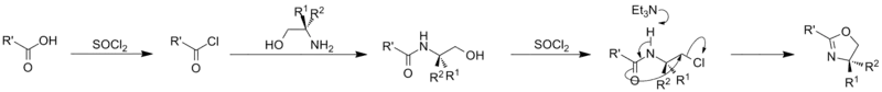 The usual route to oxazolines entails reaction of acyl chlorides with 2-amino alcohols. Thionyl chloride is commonly used to generate the acid chloride in situ, care being taken to maintain anhydrous conditions, as oxazolines can be ring-opened by chloride if the imine becomes protonated.[8] The reaction is typically performed at room temperature. If reagents milder than SOCl2 are required, oxalyl chloride can be used.[9] Aminomethyl propanol is a popular precursor amino alcohol.[10][11]