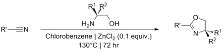 The use of catalytic amounts of ZnCl2 to generate oxazolines from nitriles was first described by Witte and Seeliger,[15][16] and further developed by Bolm et al.[17] The reaction requires high temperatures to succeed and is typically performed in refluxing chlorobenzene under anhydrous conditions. A precise reaction mechanism has never been proposed, although it is likely similar to the Pinner reaction; preceding via an intermediate amidine.[18][19] Limited research has been done into identifying alternative solvents or catalysts for the reaction.[20][21]