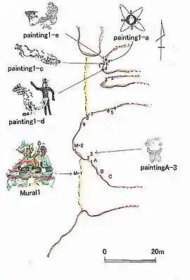 This Mural, at 3 by 2 m (9.8 by 6.6 ft), is even larger than Mural 1 but this exposed painting has been largely worn away over the intervening millennia and is now almost impossible to recognize.[5]