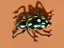 Pachyrhynchus smaragdinus is black, with a regular pattern of pale green spots.