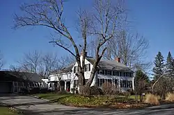 Paddock Farm is set in southern Holden, on the west side of Salisbury Street opposite its junction with Newell Road. The roughly 7-acre (2.8 ha) property includes the main house with an attached ell, a small barn, boathouse on adjacent Dawson Pond, and chicken coop. Traditional New England fieldstone walls line the property. The main house is a 1+12-story wood-frame structure, five bays wide, with a side-gable roof, end chimneys, clapboard siding, and a stone foundation. The center entry is framed by sidelight windows and topped by an entablature. The first-floor windows are typical 6-over-6 sash windows, while there are small 3-over-3 windows set in the kneewalls of the second floor. The rear ell, a similar 1+12-story structure with slightly extended height, is oriented with its gable perpendicular to that of the main house. It is joined at the other end to a small barn.[2]