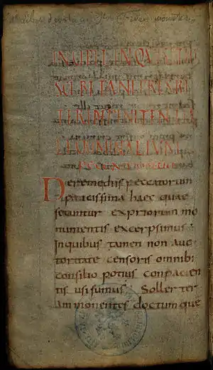![]() Folio 96v from the Sélestat manuscript (Cod. 132), showing the beginning of the Paenitentiale Bedae | |