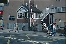 Two signal boxes were opened in 1889, the 13-lever North Signal Box beside the Torbay Road level crossing, the 17-lever South Signal Box by the Sands Road level crossing. Both were replaced in 1924 by two new boxes. The North box closed on 26 March 1988 when control of trains was transferred to the Panel Signal Box at Exeter but the South box was retained to monitor the two level crossings. In 1990 this function was transferred to a panel in the station buildings and the signal box closed.[3]