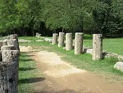 The palaistra, reserved for "confrontative," or martial arts, was on the left of the entrance to the gymnasion, which must therefore have been the passageway between items 20 and 21, which led through an entrance building.[3] Entrants could then turn left to the palaistrai or right to the dromoi,[4] an area dubbed the gymnasion by the archaeologists for convenience. Both sides were the gymnasion, a name which was sometimes applied also just to the palaistra. Along the eastern side of the dromoi was another roofed portico (stoa) and along its eastern edge more foundations and rubble. This alone could have been the remains of the oikeiseis, or the term might also include the same sort of remains on the east of the palaistra. At this point Pausanias becomes enigmatic, mentioning the oikeiseis that "turned to the southwest," one possibility being that they continued around to the south side of the palaistra.