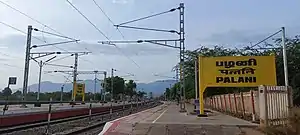 Palani Railway Station is a single-electric lined train station serving Tamil Nadu's pilgrim town of Palani situated in the western part of the state. The station is a part of the Madurai railway division of the Southern Railway zone and falls on the Pollachi–Dindigul section.
