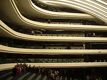 The building rises 14 stories above ground and includes three stories below ground. Its height is 75 metres (246 ft), being the tallest opera house in the world.[5] Under the metallic, expansive curved-roof structure, 230 m (755 ft) in length, the 40,000 m2 (431,000 sq ft) building contains four auditoriums: