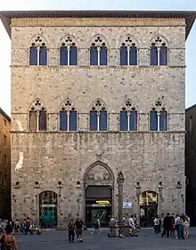 The building is one of the oldest palaces in the city and was erected between 1270 and 1275 by the Tolomei family. It served as the first permanent headquarters of the Sienese commune during the early years of the Guelph era, before the construction of the Palazzo Pubblico in the Piazza del Campo, and it also functioned as a bank and private residence.[1] It stands on the west side of the Piazza Tolomei, across from the church of San Cristoforo. The aristocratic Tolomei family for many years was associated with this parish church.[2] On the Via Banchi di Sopra, it is a few houses south and across the street of the Palazzo Bichi Ruspoli, a few blocks north of the Piazza del Campo.