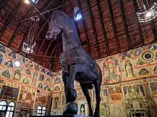 The gigantic wooden horse on the western side of the hall was built in 1466 and is modelled on Donatello's Equestrian statue of Gattamelata which is in place in front of the Saint Antony Basilica. On the eastern side there is a contemporary version of a Foucault pendulum.[2]