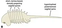| Capinatator | Chaetognatha | An arrow worm from the Burgess Shale. It has the distinction of having 50 spines around its mouth. As with modern arrow worms, the spines were used to grasp prey for consumption. C. praetermissus is thought to represent a stage of chaetognathan evolution before arrow worms became planktonic swimmers. | ![]() | |
