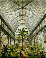 Several forerunners were built in the Palace Park in the 18th and 19th centuries, under Emperors Francis I and Joseph II. The present building was built by Ignaz Gridl following plans by court architect Franz-Xaver von Segenschmid,[1] known for his projects of bridges, and Sigmund Wagner. Groundbreaking took place in 1881 and Franz Joseph I opened the greenhouse on 19 June 1882.[2] Since 1918 it has been run by the Bundesgärten (Federal Gardens). A heavy bomb attack on Schönbrunn Palace in February 1945 destroyed most of the glazing of the Palmenhaus. Many plants died, although some were saved by being transferred to the nearby Sonnenuhrhaus. The rebuilding began in 1948, and the Palmenhaus was reopened in 1953.