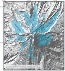 Palmer Glacier is an extinct glacier on the south slopes of Mount Hood in the U.S. state of Oregon. With glacial ice movement having stopped in the mid 1980s, it is now considered a snowfield rather than an active glacier.[2] The former glacier, now snowfield, is situated at an elevation range of 9,300 to 6,200 feet (2,800 to 1,900 m), and was named for Joel Palmer, an Oregon pioneer. Palmer Glacier is the most well-known of the twelve glaciers on the mountain, despite no longer technically qualifying as a glacier, and is a popular destination for snowsports enthusiasts as it is the only US resort that consistently runs it's chairlifts from winter through summer.