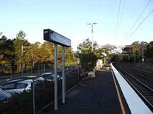 Palmwoods station opened in 1891.[1] The station today consists of one platform with a wooden structure. In 2009, the platform was extended at both its northern and southern ends with scaffolding and plywood materials.[2] Initially intended as an interim arrangement until a permanent extension was built, the temporary platform remains.[3]