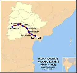 - ↑ "Hyderabad: Palnadu Express, first disabled-friendly train". Deccan Chronicle. 14 January 2018. Retrieved 25 October 2020.