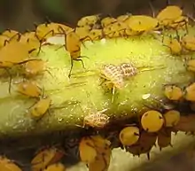 Myzocallis asclepiadis surrounded by Aphis nerii
