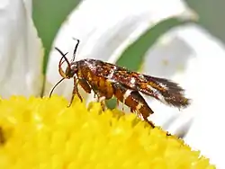 Pancalia leuwenhoekella has a wingspan of 10–12 mm. The head and thorax are dark bronzy-metallic. Antennae usually with white subapical band. Forewings are deep orange, margins more or less blackish; a narrow interrupted fascia at 1/4, a costal spot before middle and another inwardly oblique at 3/4, a dorsal median spot and an erect tornal mark pale golden-metallic, blackish-edged ; a whitish spot in cilia on posterior costal spot. Hindwings are rather dark bronzy-fuscous.[4] This species is very similar to Pancalia schwarzella . [3]