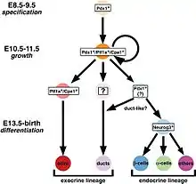 - ↑ Gu, G.; Dubauskaite, J.; Melton, D. A. (2002). "Direct evidence for the pancreatic lineage: NGN3+ cells are islet progenitors and are distinct from duct progenitors". Development. 129 (10): 2447–2457. doi:10.1242/dev.129.10.2447. PMID 11973276.