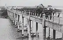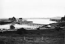 Between 1847 and 1852, a number of towns in the Auckland Region were established by Governor George Grey as outposts for the Royal New Zealand Fencible Corps, a collection of retired British and Irish soldiers, to serve as a buffer against a perceived threat of war from the south.[2] These included Panmure on the Auckland isthmus, on the western shores of the Tāmaki River, and Howick, east of the isthmus surrounded by farmland. In 1857, residents petitioned the Auckland Provincial Council for a bridge across the river,[3] to replace the inconsistent ferry services.[4] The Tamaki Bridge Act was passed in February 1864,[1] allowing the province to raise funds for its construction, however financial difficulties delayed the project.[4] Initially designed by William Rickford Collett, the bridge was constructed of steel, basalt rock from Melbourne, tōtara wood piles and a kauri deck. It was 175.6 m (576 ft) long, had a width of 6.4 m (21 ft), and required Muntz metal sheaths for the timber piles to prevent attack by Teredo navalis shipworms.[3] William Weaver, the Engineer-in-Chief to Auckland Province, created a scale-model of the design, which he showcased at the 1865 New Zealand Exhibition.[1]