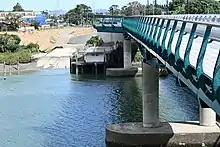 Tenders to replace the ferro-concrete bridge were sought in 1956.[6] A variety of designs for the bridge were proposed, including a steel box-girder bridge, pre-stressed concrete and welded plate girder designs.[6] The final accepted design used reinforced concrete supported by steel girders.[6] A three-lane reinforced high-level bridge was opened in October 1959.[3] The 1959 bridge has a reversible direction lane, allowing for two westward city-bound lanes operating in mornings and two eastbound lanes operating in evenings.[3] In 1971, the Pakuranga Highway Bridge / Waipuna Bridge was constructed to the south,[9] which became the more popular route for traffic to cross the Tāmaki River.[3]