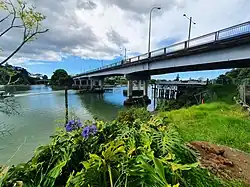 In 2021, a parallel bridge was built adjacent to the 1959 Panmure Bridge, as a part of the Eastern Busway Project.[10] The new bridge is a mixed use busway, cycling and pedestrian bridge,[11] located overtop of the location of the original 1865 bridge. The busway bridge traverses the location of the swing-span mechanism on the eastern shores, and on the western shore the location of Mokoia pā, a 19th-century Ngāti Pāoa settlement, which is also covered by residential housing.[1]