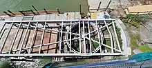 The original bridge's swinging steelwork and bluestone pier remained intact after the bridge's demolition, housed underneath the site of a ship chandlery.[3] After repairs in 2013, the swing-span mechanism on the east side was added to the New Zealand Historic Places Trust register in 2014.[1] In 2023, the decrepit building above the swing bridge was demolished, exposing the remains of the 1865 bridge.[7][8]