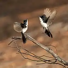 A conspicuous bird, the paperbark flycatcher is usually seen in pairs or singly. It sweeps its tail restlessly from side to side and often hovers near the ground when searching for food.[6]