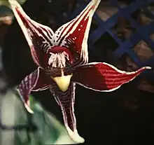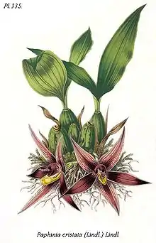 Paphinia cristata is a species of the orchid genus Paphinia and the type species of this genus. It is endemic to northern South America and the island of Trinidad. Its 1 to 3 flowered pendant inflorescence carries large, deep-red flowers. The species was published in 1843 in Edwards's Botanical Register 29: misc. page 14.[1]