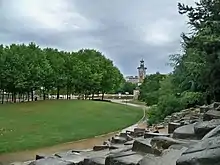The park has lawns, groves of trees, and a "wall" of artificial rocks for children to climb