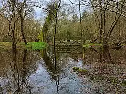 This mature wood is mainly oak and beech on clay soils. There are several sequoia trees which were planted in the Victorian period. There are ponds and dells in the north of the site, which is dominated by rhododendrons.[1]