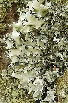 The lichen was first described in the scientific literature as Parmelia nilgherrensis by William Nylander in 1874.[2] This taxon was later (1875) transferred by Ferdinand Arnold into Imbricaria (a now obsolete genus name sunk into Anaptychia).[3] However, Nylander's 1874 publication of this species is an illegitimate homonym, as he had previously published this name with a different type in 1869.[4] In 1924, Gustaf Einar Du Rietz described the same taxon as Parmelia arnoldii.[5] Mason Hale transferred it to Parmotrema in 1974, as part of a taxonomic transfer of all species in Parmelia subgenus Parmelia section Irregulare.[6] It is commonly known as the powdered ruffle lichen.[7]