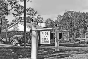 Around 1951, David carved two large bushfire awareness totem poles from the very durable Gippsland Grey Box (Eucalyptus bosistoana), which sat outside the FCV's Noorinbee office.[1]