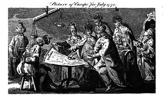 a ^ The picture shows the rulers of the three countries that participated in the partition tearing a map of Poland apart. The outer figures demanding their share are Catherine II of Russia and Frederick II of Prussia. The inner figure on the right is the Habsburg Emperor Joseph II, who appears ashamed of his action (although in reality he was more of an advocate of the partition, and it was his mother, Maria Theresa, who was critical of the partition). On his left is the beleaguered Polish king, Stanisław August Poniatowski, who is experiencing difficulty keeping his crown on his head. Above the scene the angel of peace trumpets the news that civilized 18th-century sovereigns have accomplished their mission while avoiding war. The drawing gained notoriety in contemporary Europe, with bans on its distribution in several European countries.[26]