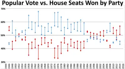 - ↑ In the 102nd through 109th Congresses, Independent Bernie Sanders of Vermont caucused with the Democratic Party. Independent Jo Ann Emerson switched to the Republican party on January 8, 1997.