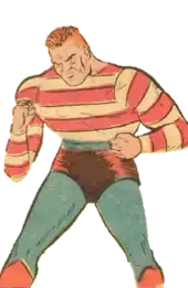 Patrick "Pat" Dugan was the chauffeur of young rich-kid Sylvester Pemberton.[3] He got involved in superheroics after aiding Pemberton against enemy spies. The two team up as embodiments of the American flag, Sylvester as the Star-Spangled Kid and Pat as Stripesy, to track down and stop the spies.[4]
