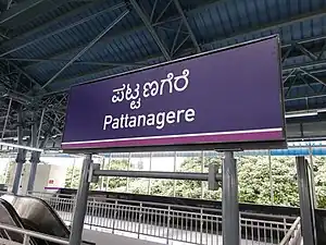 Pattanagere is an elevated metro station on the East-West corridor of the Purple Line of Namma Metro serving the RV College of Engineering, RV University in Bangalore, India. To the north lies the Jnanabharathi area and to the south is the suburbs of Kengeri. It was inaugurated on 29 August 2021 and commenced to the public on 30 August 2021.[1][2]