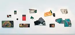 A year later, in November 2016, the series was exhibited at the exhibition Mall. The Time of Colorful Sheds was organized as part of the Non-Places Programme run by the Department of Research Art and hosted by the Smena Center of Contemporary Culture in Kazan. In 2015, Otdelnov's contemplations on the notion of glitches in the post-Soviet landscape were presented at two other exhibition projects. In July 2015, he made a total installation for the exhibition Piece of Space Traversed by Mind at the New Wing of Gogol Museum on Nikitsky Boulevard: he painted a monochrome landscape on the walls with a snow field, gray sky, and power transmission line pylons, and the "glitch" was manifested in Lego bricks suspended on thin wire. In 2015, Otdelnov also participated in Expanding Space. Art Practices in the Urban Environment, a project aimed at creative exploration of contemporary phenomena and features of Moscow, organized by V-A-C Foundation. Otdelnov proposed a large-scale object constructed with bright composite panels to be installed next to the Moscow Ring Road near the 81st kilometer. It employed the parallax effect to make the structure seem stably whole from one vantage point but, as the perspective shifts, to disintegrate into parts becoming fluid and unstable. This piece was meant to imitate abandoned or uncompleted mall projects that look like a disruption in the landscape and, at the same time, symbolize the volatility in the economy.[40][41][42][43][44][45]