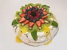 Pavlova is a meringue-based dessert. Originating in either Australia or New Zealand in the early 20th century, it was named after the Russian ballerina Anna Pavlova.[1] Taking the form of a cake-like circular block of baked meringue, pavlova has a crisp crust and soft, light inside. The confection is usually topped with fruit and whipped cream.[2] The name is commonly pronounced /pævˈlvə/ pav-LOH-və or (in North America) /pɑːvˈlvə/ pahv-LOH-və, and occasionally closer to the name of the dancer, as /ˈpɑːvləvə/ PAHV-lə-və.[3][4][5]