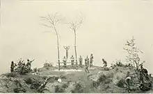 Most of the actual ceremony took place in the earth lodge of the visionary, since the Pawnee villages did not have a special ceremonial lodge.[14]:14 Bystanders outside dug holes in the wall and tore the roof apart to follow the elaborate ceremony.[14]:120 A procession of all the men and boys – even male infants carried among the men – accompanied the girl out of the village to the scaffold. Together they awaited the morning star. When the star was due to rise, the girl was placed and tied on the scaffold. At the moment the star appeared above the horizon, the girl was shot with an arrow from a sacred bow,[14]:107 then the priest cut the skin of her chest to increase bleeding. She was shot quickly with arrows by all the participating men and boys to hasten her death. The girl was carried to the east and placed face down so her blood would soak into the earth, with appropriate prayers for the crops and life she would bring to all life on the prairie.[8]:106