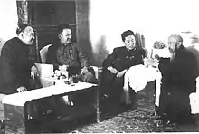 The Second ETR, initially led by Elihan Tore, was founded in November 1944 during the Ili Rebellion with Soviet support and was based in three northwest districts of Xinjiang.[7] Tore disappeared in the Soviet Union in 1946, and another ETR leader, Ehmetjan Qasimi, head of the pro-Soviet Sinkiang Turkic People's National Liberation Committee, reached a political agreement with the Nationalist Chinese leader Zhang Zhizhong to form a coalition provincial government in Dihua (present-day Urumqi).[8] The Second ETR was disbanded in name but the Three Districts retained autonomy.[7] Qasimi became the vice-chairman of the coalition government.[9] In June 1947, the Nationalist Chinese forces clashed with Mongolian and Soviet forces at Beitashan in northeastern Xinjiang. In that conflict, Kazakh leader Osman Batur of the ETR repudiated the ETR and defected to join Nationalist Chinese forces in fighting against Soviet-backed Mongolian forces.[10]