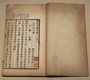 In the early Qing dynasty, the rise and fall of the dynasty touched many poets and playwrights, especially intellectuals, which pushed them into thinking of the historical lessons taught by the downfall of the Ming.[6] These writers, including Kong Shangren, expressed hatred and regret at its collapse through their works and a sense of historical responsibility. Kong said he wanted to make clear what had made the decay happen.[7] Kong heard stories about the period of Hong Guang (C: 弘 光) from his cousin Kong Fangxun (孔方訓), whose tale of Li Xiangjun inspired him into creating a script.[8] But at that time, it was only a draft because Kong wanted to collect historical details.[9] So during his three-year stay in the south, where the story took place, Kong got acquainted with Ming loyalists like Mao Xiang (冒襄), Deng Hanyi (鄧漢儀), Xu Shuxue (許漱雪), Zong Yuanding (宗元鼎), She Chacun (社茶村) and masters of art like Shitao, Gong Xian, and Cha Shibiao (查士標). He also visited historical sites such as Plum Blossom Mountain (梅花岭), Qin Huai River (秦淮河), Swallow Rock (燕子磯), Imperial Palace, and the Mausoleum of the Ming Emperor (明孝陵).[10]