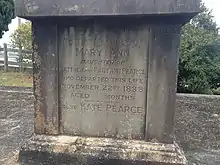 The original pioneers Matthew Pearce (died 1831) and his wife Martha (died 1843) have monumental inscriptions in this cemetery as have many of their descendants. However it is not possible to say for certain when the first burial took place on this land. There are monumental inscriptions for three children of Matthew Woodward Pearce – George Henry (died 1847 aged 5 years), another George Henry (also died 1847 aged 5 days) and Matilda Susannah (died 1850 aged 2 years). In 1865 William Thomas Pearce died and was buried at St Bartholomew's, Prospect. His wife Eliza died in 1878, and there are monumental inscriptions for this couple at the cemetery. In 1876 Mary Anne Pearce (wife of Matthew Woodward Pearce and mother of the three children already mentioned) died, and her husband Matthew Woodward Pearce, the (original) landowner died in 1878. His death certificate shows he was buried at St John's Cemetery, Parramatta, and the St John's burial register confirms the couple were buried there.[4] Nonetheless, they are monumental inscriptions to this couple at the family cemetery.[1]