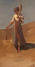 Peasant Girl, spinning is the title given by nineteenth century American expatriate artist Elihu Vedder to an oil painting on canvas that depicts a young female figure spinning wool into thread. The work was completed in 1867 at the artist's studio in Via Margutta, Rome, and represents a slightly scaled up, slightly elaborated version of a theme Vedder had first developed in an oil sketch during the summer of the same year.[1]
