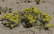 Pectis angustifolia, the lemonscented cinchweed, is a summer blooming annual plant which is found in Western North America, generally from Nebraska and Colorado to Arizona and Mexico. It is in flower from July to October, and the seeds ripen from September to October. Lemonscented cinchweed cannot grow in the shade. The plant is carminative and emetic. The crushed leaves have been used in the treatment of stomach aches.