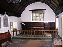 The interior has a barrel-shaped ceiling from the sixteenth century and a four-bay Perpendicular arcade.[3] It also contains an elaborate coat of arms of Queen Anne, dating from 1707.[5] The altar table was carved in 1916 by a war refugee from Belgium, who was reputed to be a master carver at St. Rumbold's Cathedral in Mechelen.[6]