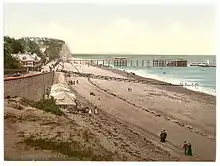 On August Bank Holiday 1931,[2] a fire broke out in the wooden theatre. A dramatic sea and land rescue commenced, with the fire department attending the scene until the fire burnt out three days later.[7] Over 800 people survived.[2] As a result, a large proportion of the pier was destroyed.[5] The pier was rebuilt at a cost of £3,157, without replacement of the wooden pavilion.[6]