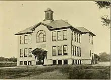 A new union school building was constructed in 1907 at 2070 Five Mile Line Road, just a little north of the Four Corners.[5][13] A high school alumni group was organized as early as 1912.[14] In the fall of 1913, the high school opened for the year with a faculty of six: principal George Cooper; preceptress Mable Thomas; teachers Edna Payne (sixth and seventh grades); Cora Drummon (fourth and fifth grades); Helen Thomas (second and third grades)and Julia McNab (primary).[15] The class of 1919 consisted of only one graduate, Luella Engelhart.[16]