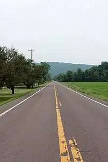 PA 642 continues into Liberty Township in Montour County and becomes Liberty Valley Road, running through more open agricultural areas with some residences. The road heads into woodland and intersects the eastern terminus of PA 45, continuing through a mix of farmland and woods with homes. The route heads through more rural areas, crossing into Valley Township and passing through the residential community of Mausdale before intersecting PA 54. A park and ride lot is located east of this intersection. Here, PA 642 turns southeast to form a concurrency with PA 54 on Continental Boulevard, a four-lane divided highway. PA 642 splits from PA 54 by heading northeast on two-lane undivided Jerseytown Road. The road heads through farmland and woodland with some homes, passing over I-80. The route continues north into more forested areas with some fields and residences, becoming the border between Derry Township to the west and West Hemlock Township to the east. PA 642 turns northeast to fully enter West Hemlock Township and runs through more agricultural and wooded areas with occasional homes.[2][4] The road heads into Madison Township in Columbia County and becomes Danville Road, heading through more wooded areas with some fields, reaching an intersection with PA 44. The route continues north concurrent with PA 44, heading through open agricultural areas with occasional residences and businesses. The road turns northwest and intersects PA 254 in Jerseytown, where PA 642 ends and PA 44 continues northwest.[2][5]