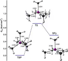 At -110 °C, Bi(CH3)5 is a blue-violet solid. The methyl groups are arranged in a trigonal bipyramid, and the bond-lengths of methyl with bismuth are all the same. However, the molecule is not rigid, as can be determined from the nuclear magnetic resonance spectrum that shows all methyl groups are equivalent.[4] It is stable as a solid, but in the gas phase, when heated or in solution decomposes to trimethylbismuth.[3][4] The colour is unusual for bismuth or other hypervalent pnictide compounds, which are colourless. Calculations show that the colour is due to HOMO-LUMO transition. The HOMO is ligand based, whereas the LUMO is modified by relativistically stabilised bismuth 6s orbitals.[5]