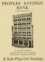 PeoplesBank is a branch bank incorporated on March 19, 1885 as Peoples Savings Bank. Its first president was William Skinner of William Skinner and Sons Silk, who would serve as the bank's president from its founding until 1901, a year before his passing. A number of prominent figures in Holyoke's founding would work for the bank, including architect George P. B. Alderman, who sat on its board, and Judge John Hildreth, as a clerk, whose Oakdale estate, the Yankee Pedlar, was reopened as a branch of the bank in 2019.[2][3][4] It was first headquartered in Downtown Holyoke, Massachusetts with an additional office in Springfield, Massachusetts. In 1974, the bank would expand its headquarters with a large Brutalist commercial block at the corners of High and Suffolk Streets as part of a city revitalization campaign, where it maintains a branch today.[5]
