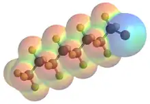 This molecular model of Perflubron is color-coded by electron density to illustrate the positive polarisation of the large bromine atom by the inductively electron-withdrawing perfluorooctyl chain.